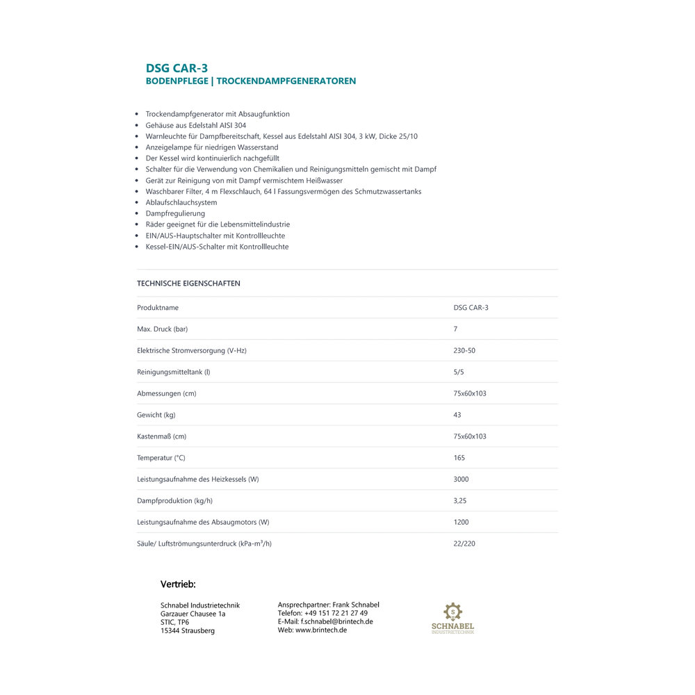 Der DSG CAR-3 EXV ist ein professioneller Dampferzeuger mit Saugfunktion. Er wurde speziell für die gründliche Reinigung und Desinfektion in industriellen Umgebungen sowie im Lebensmittelbereich entwickelt.